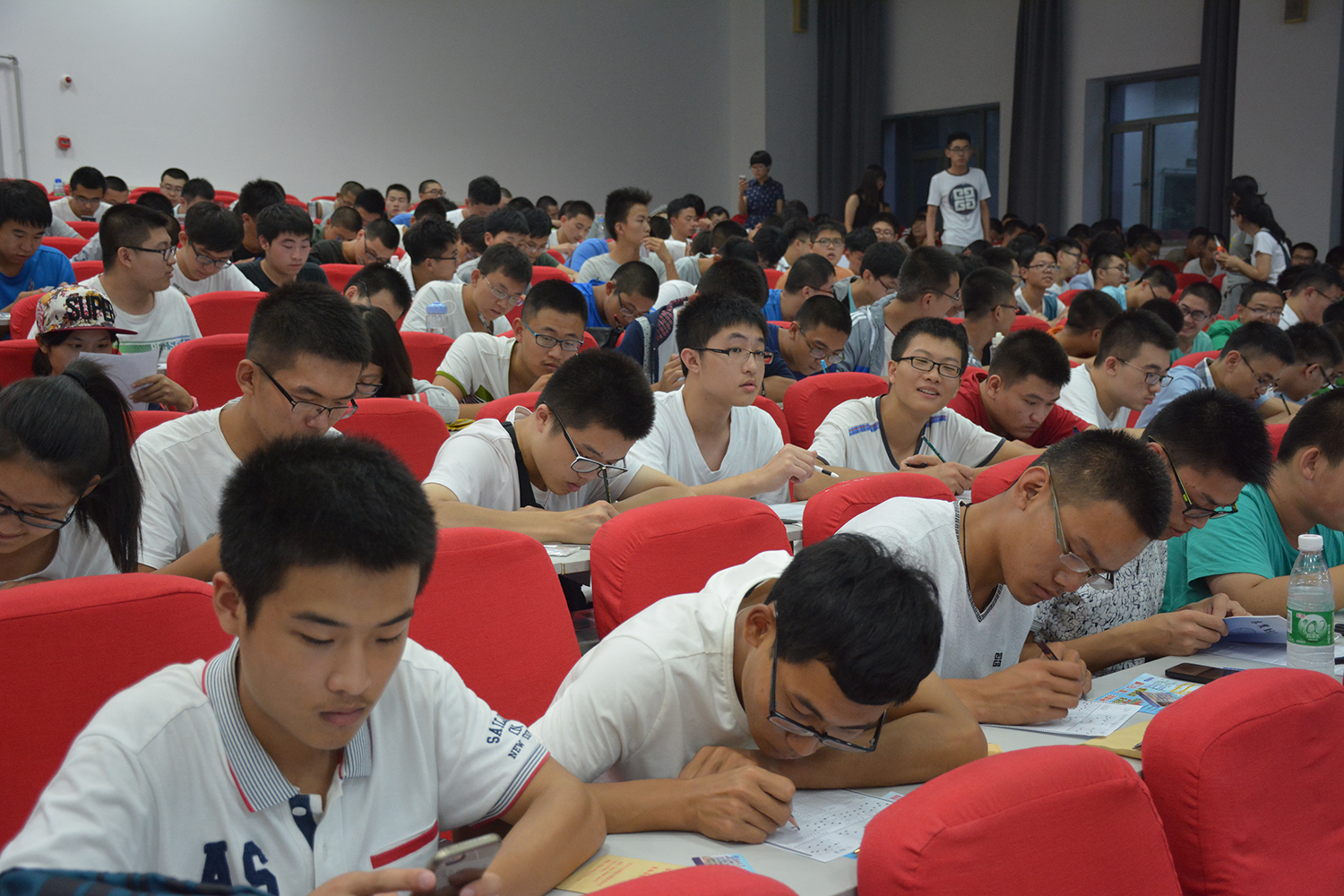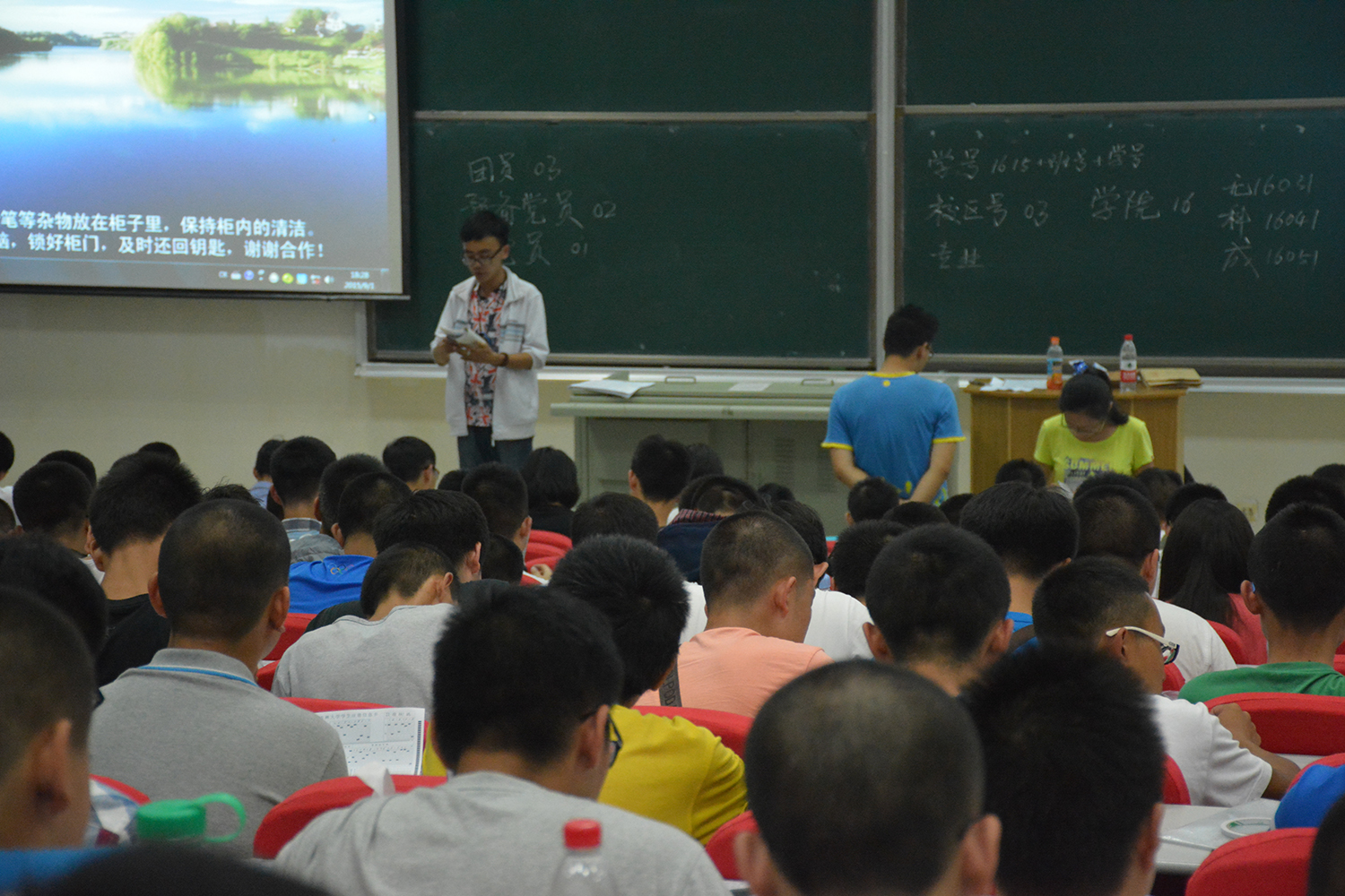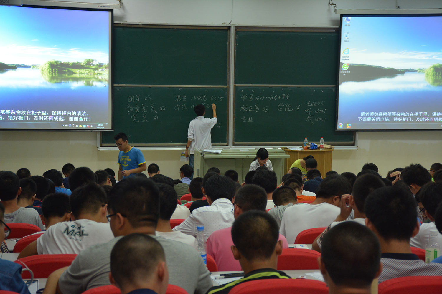 傍晚5时30分,各班辅导员助理将本班同学带到逸夫教育大楼门前集合并清点人数,全体新生到齐后统一带到逸夫教育大楼B110进行注册信息填涂。今年的新生信息采集工作仍采取填涂信息采集卡的方式,全体新生在各班班主任助理的组织与指导下快速准确地填涂信息卡,班主任助理们耐心地为每一个新生答疑解惑,同时这让新生们倍感温暖,消除了新生们刚进入大学校园的陌生感。填涂完毕后各班班主任助理将学生填涂完毕的信息卡按照学号排序,以班级为单位清点好放到一个档案袋中,并在档案袋上标记班级及人数,同时将各班信息统一在“新生填涂卡信息汇总表”中进行登记,再在规定时间集中交到指定地点。大约8时30分,全体新生已将信息卡填涂完毕并交与各班负责人,各班班主任助理组织好各班学生统一带出教室解散,新生信息注册工作圆满结束。